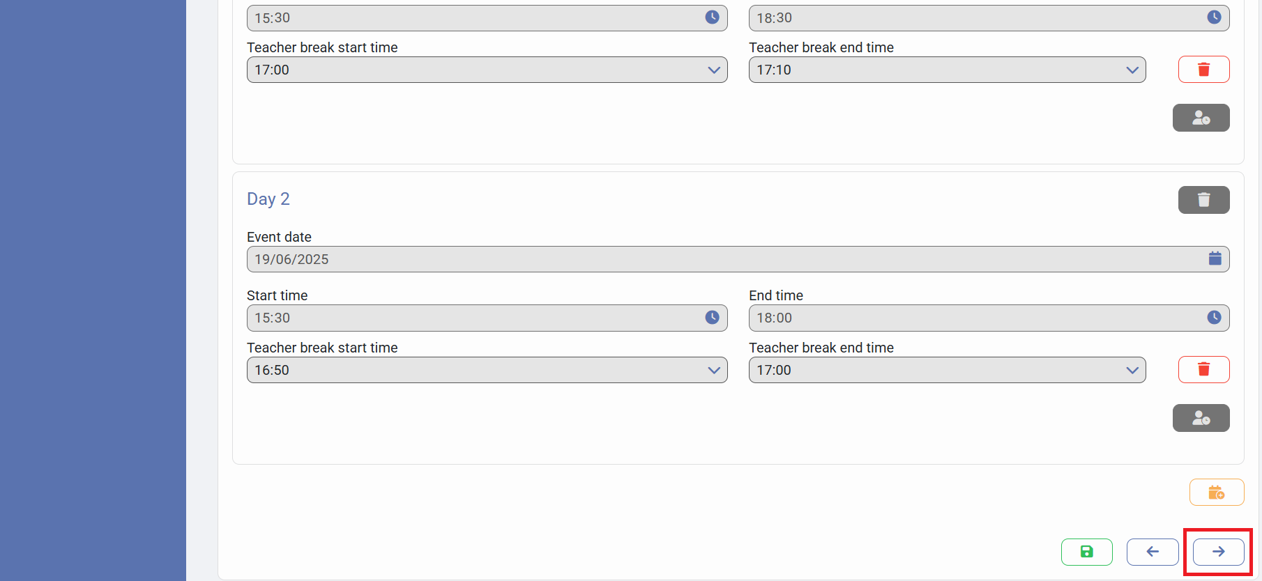 5) Click on "Next" to proceed to the "Event Date & Times for [Event Name]" screen