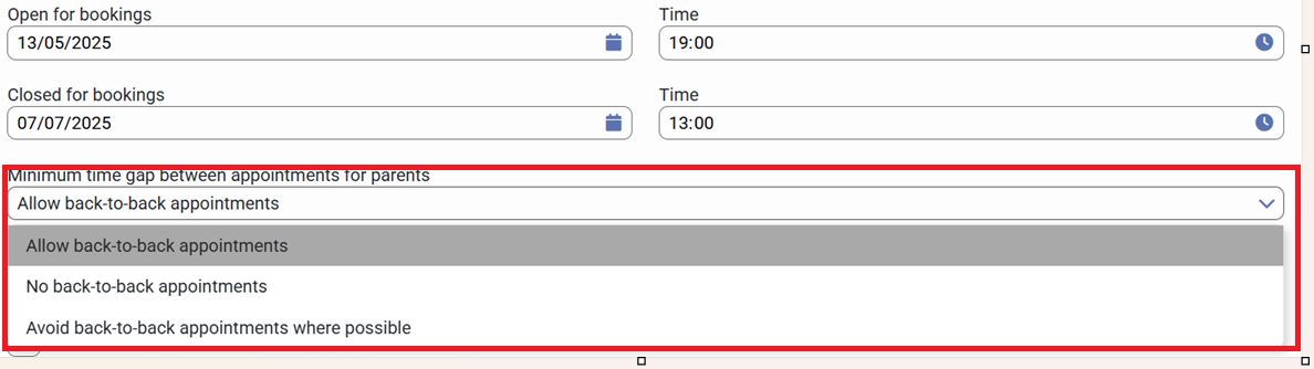 7) Click on "Minimum time gap between appointments for parents" and choose the option that you need to use: