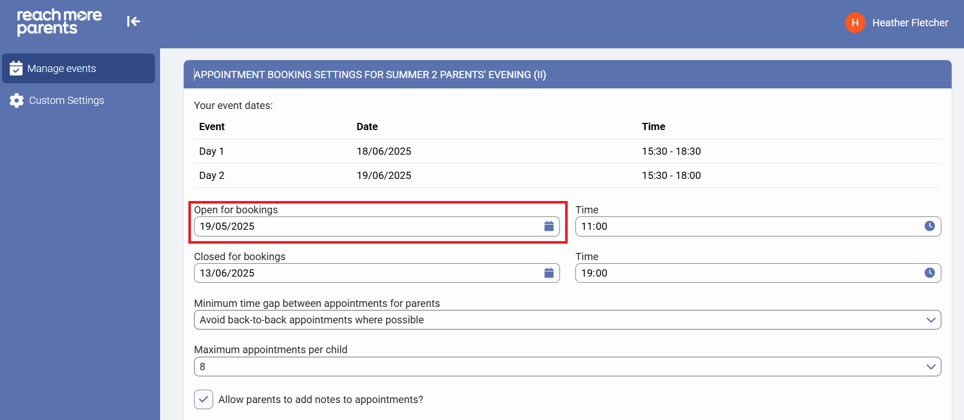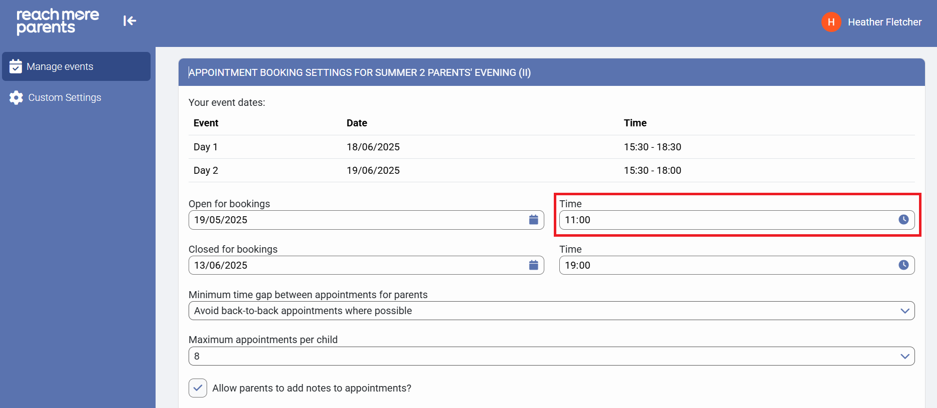 8) Click on the "Time" field for the "Open for bookings" date field and type the new time you will be closing the booking window