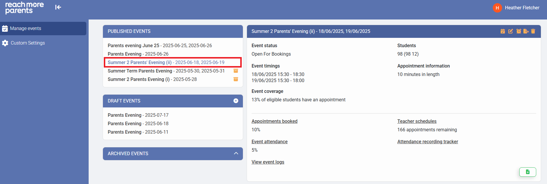 3) Click on the "Event Title" required from either "Draft Events" or "Published Events"