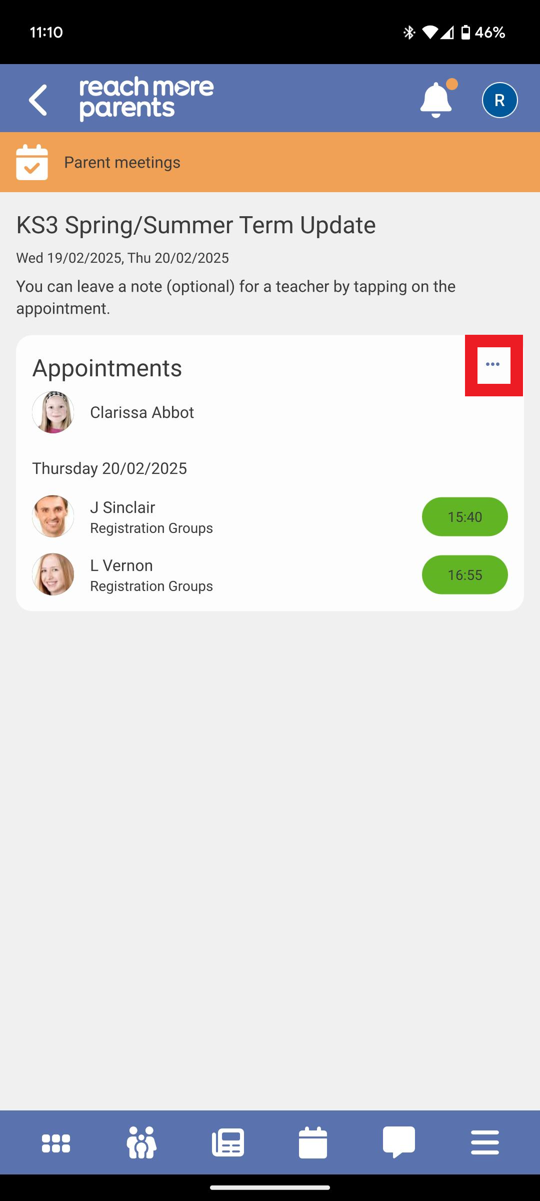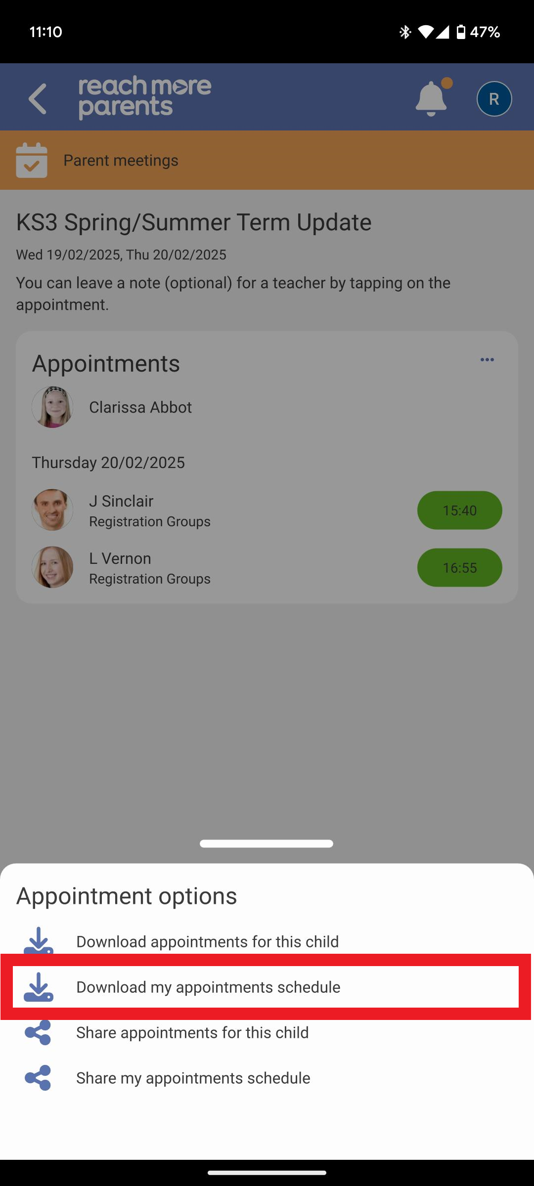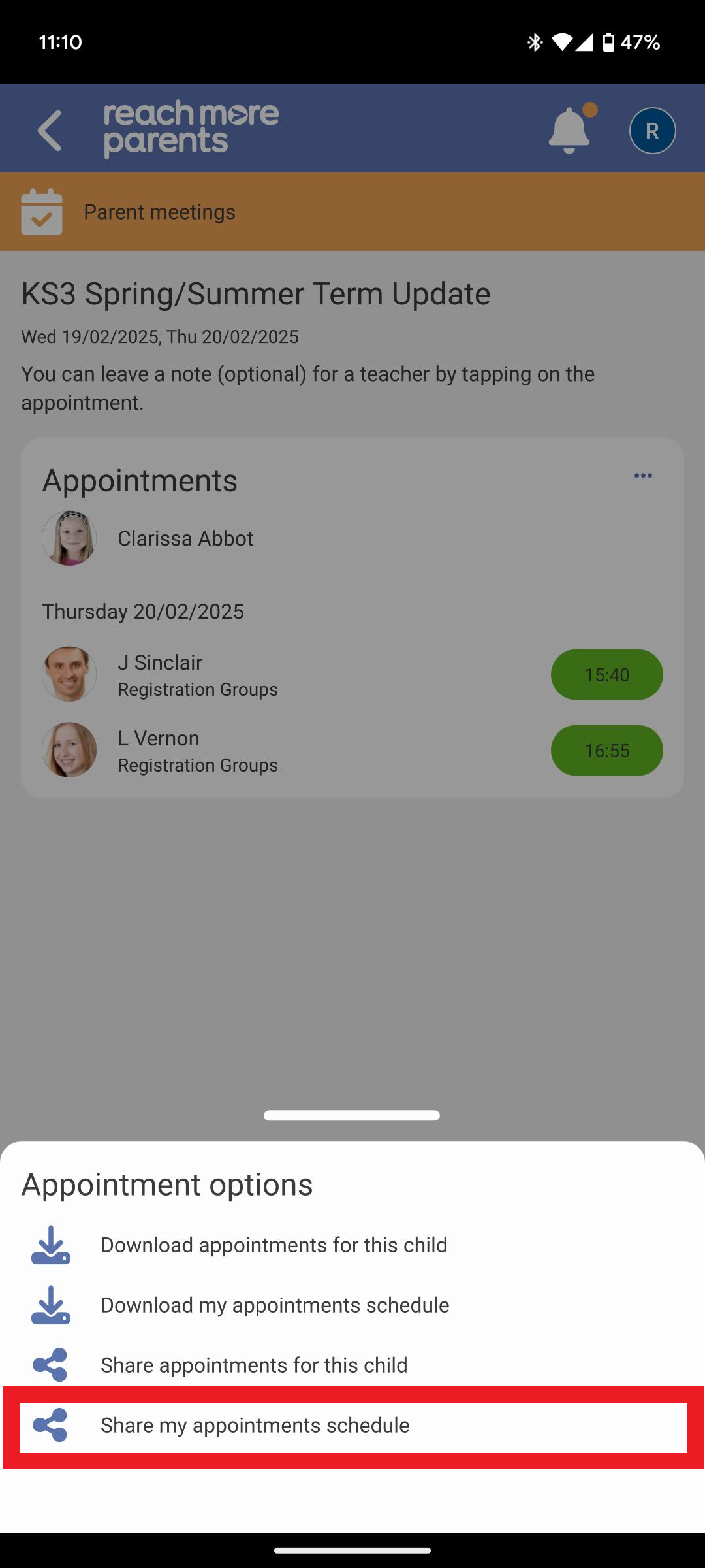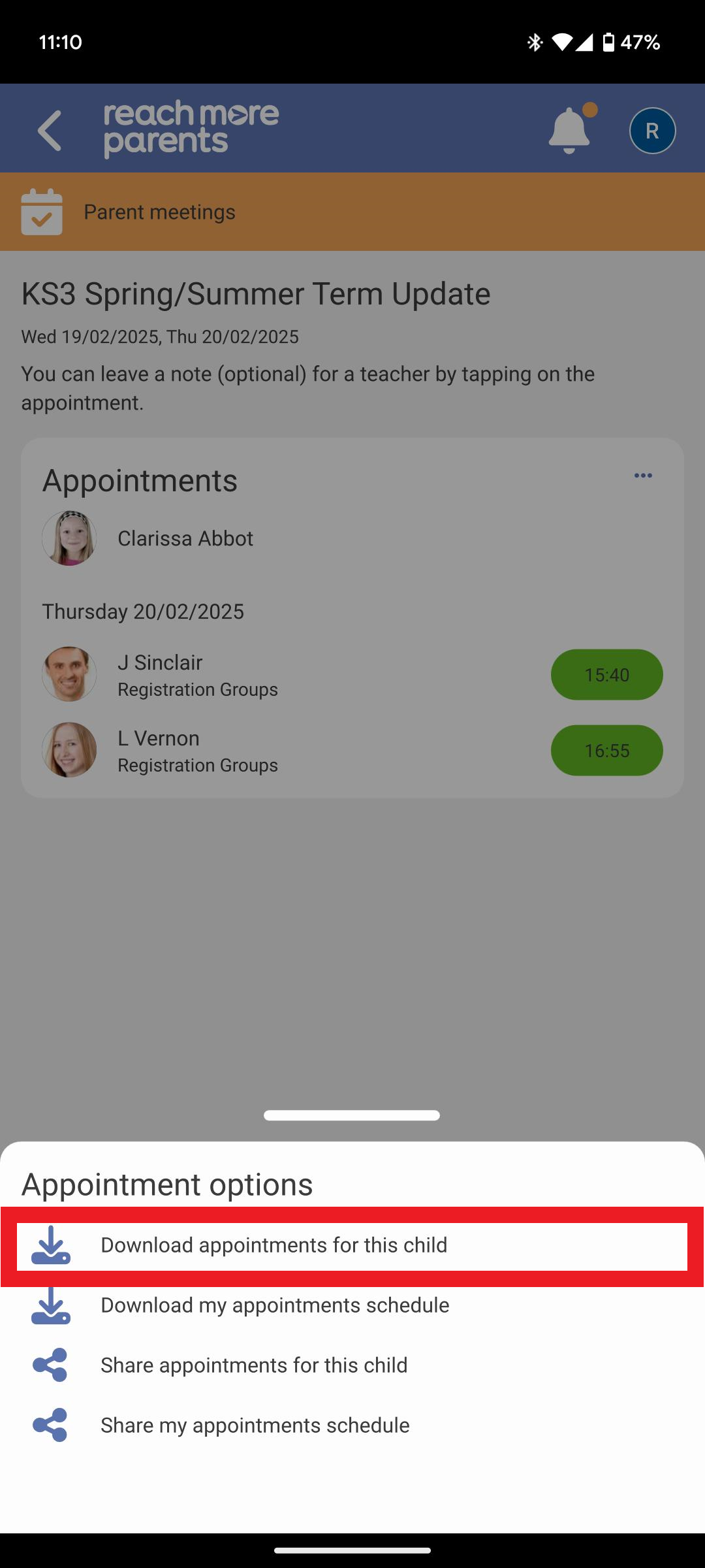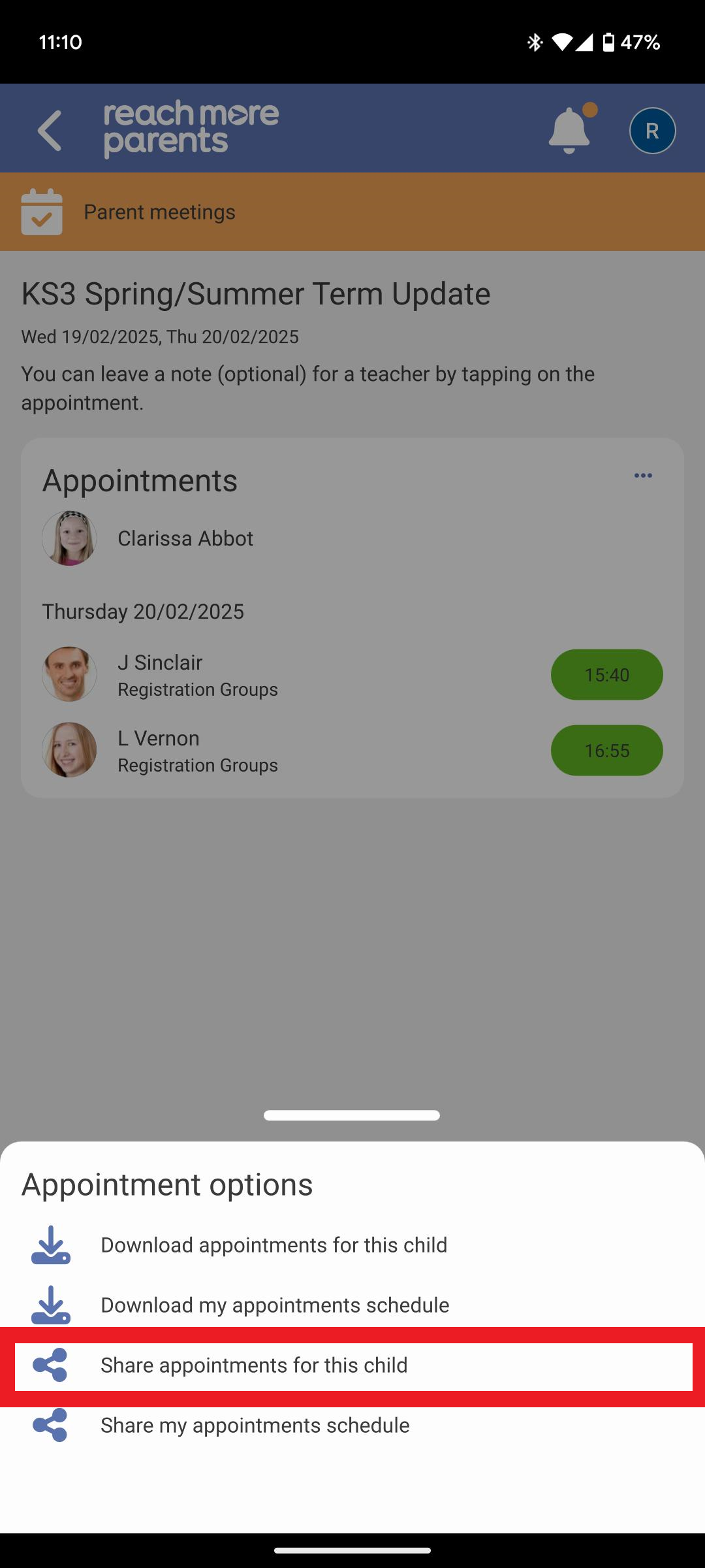 If you want to export the appointments you've made through the app to the other parent/carer for your child, this is possible and easy to achieve within the "View/Amend appointments" screen.