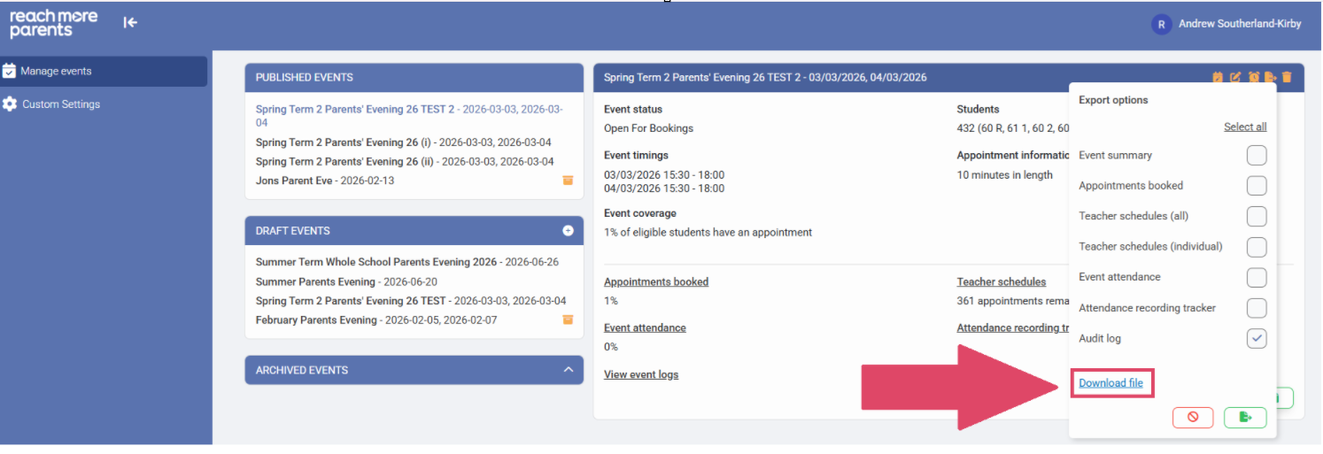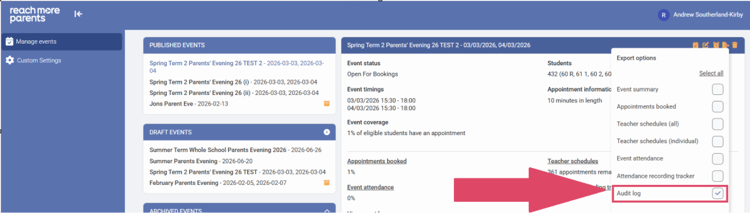 As a Parent Event administrator, there may come a time where you need to track the changes made to various appointments for an event. In this article, we will detail how to access the Audit Log export to review all the changes to an event and it's appointments.