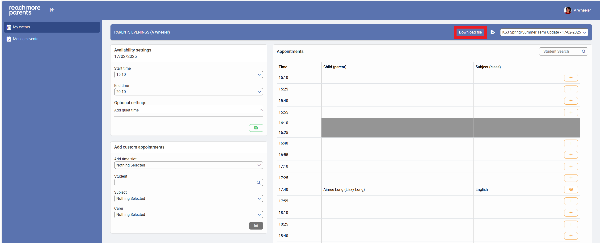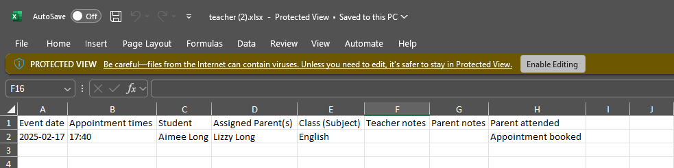 7) Open the excel file and the schedule will be listed in full with "Event Date", "Appointment Times", "Student", "Assigned Parent(s)", "Class (Subject)", "Teacher notes", "Parent notes" and "Parent Attended" headings