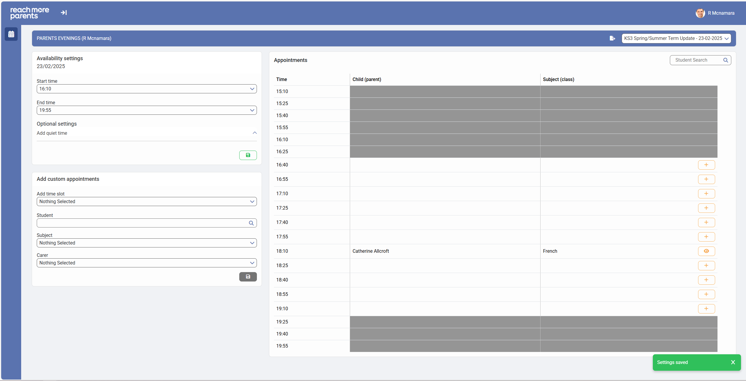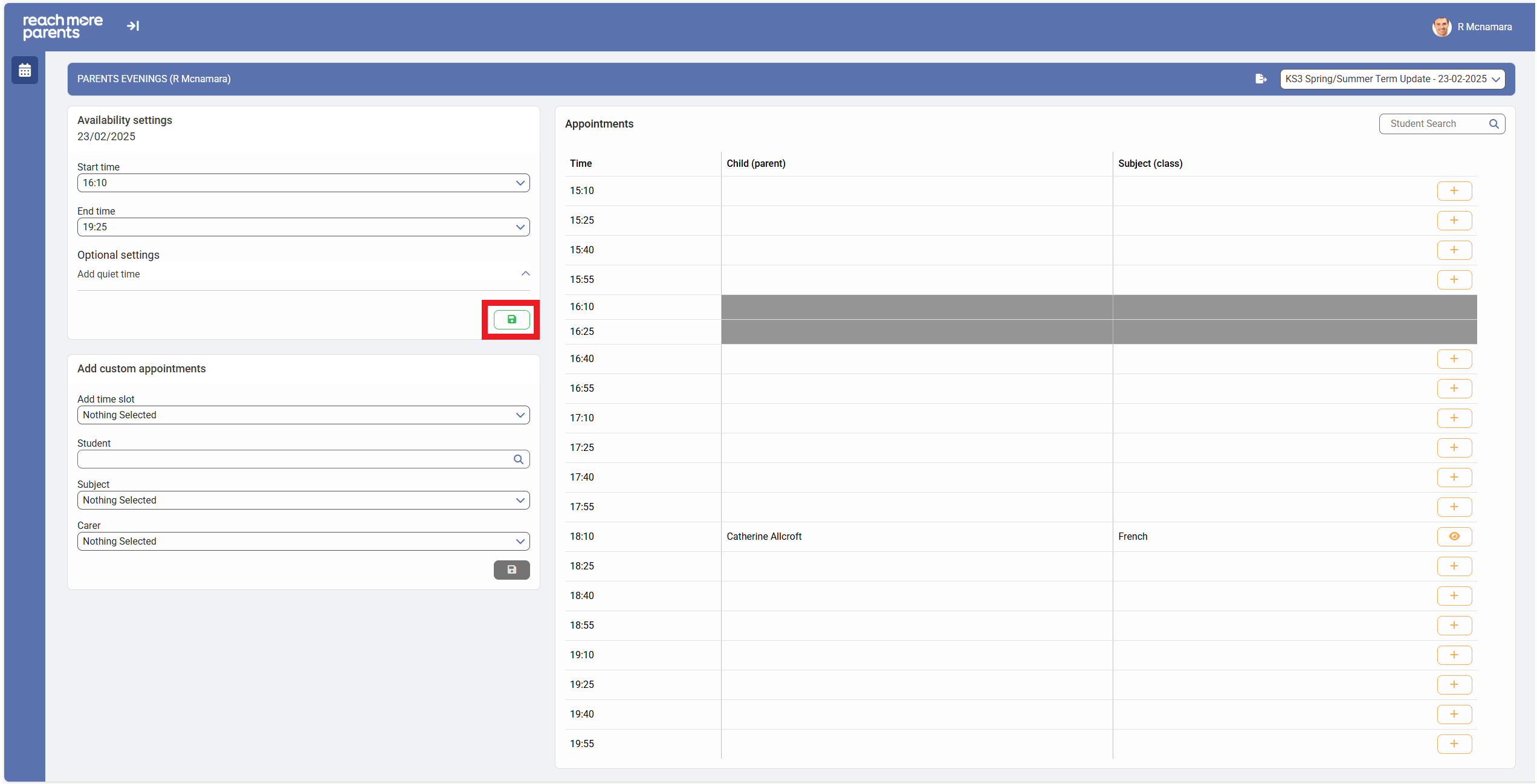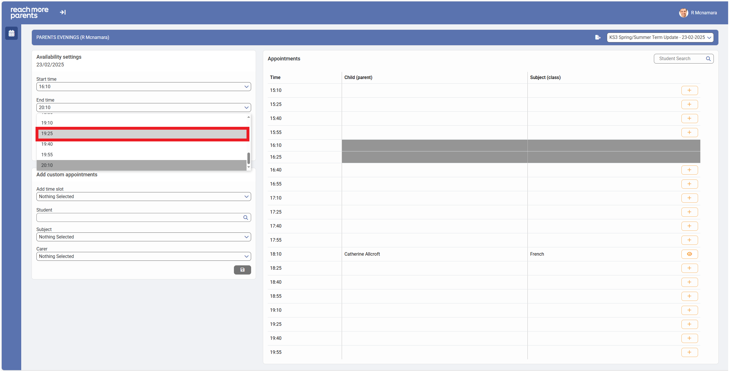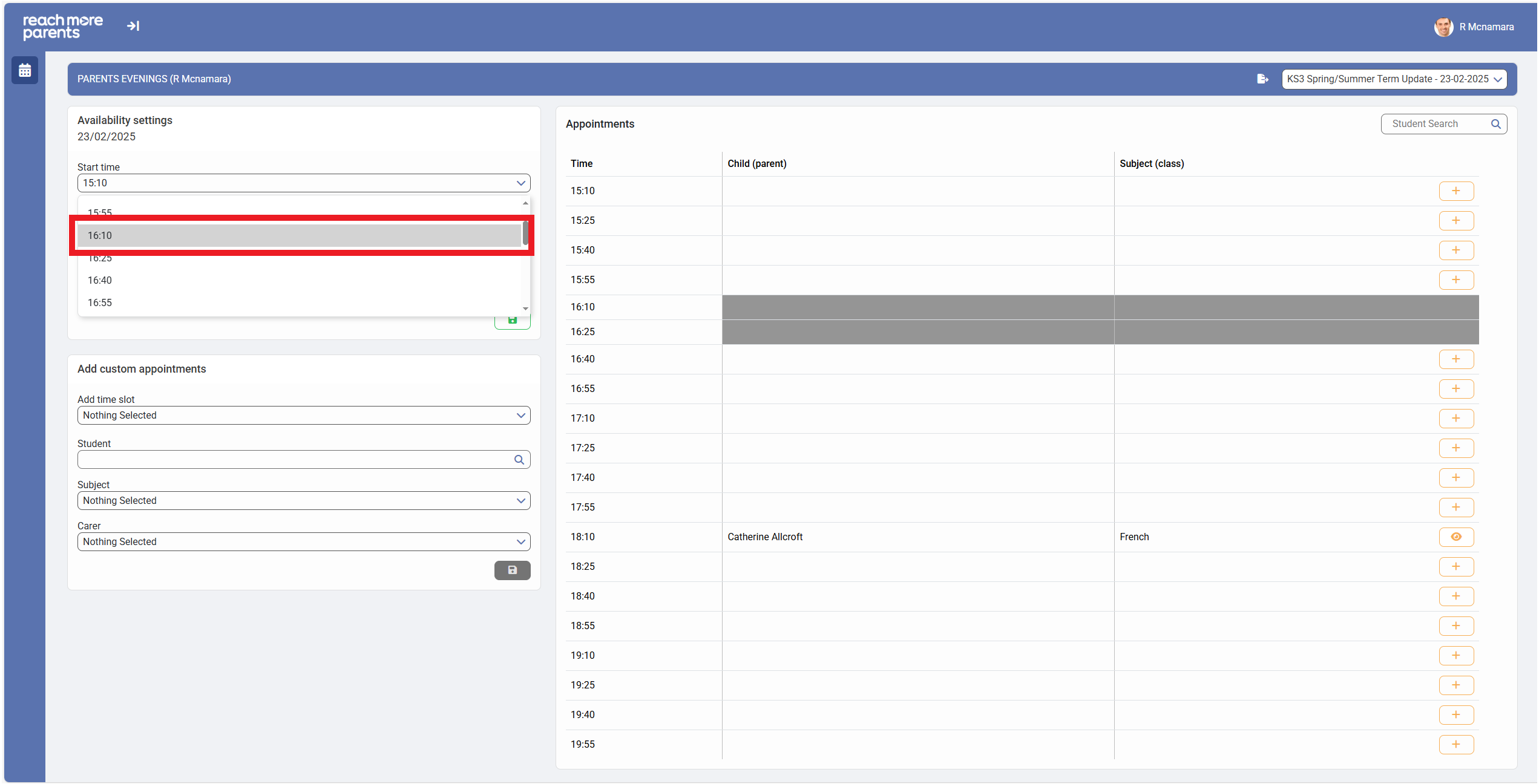 2) Click on the "Start Time" field in the "Availability Settings" block if you need to start the Parent Meetings event a little later than the current start time