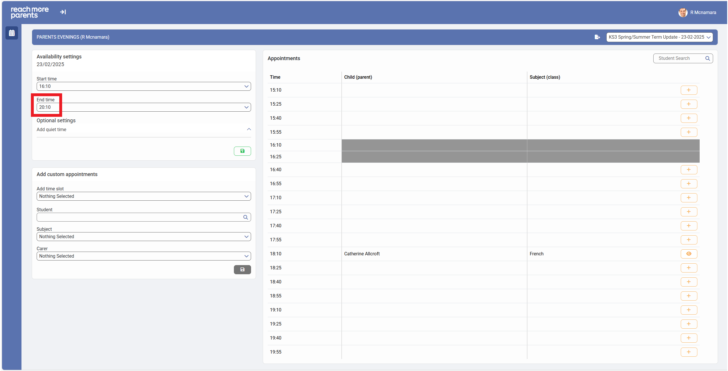 4) Click on the "End Time" field in the "Availability Settings" block if you need to end the Parent Meetings event a little earlier than the current start time