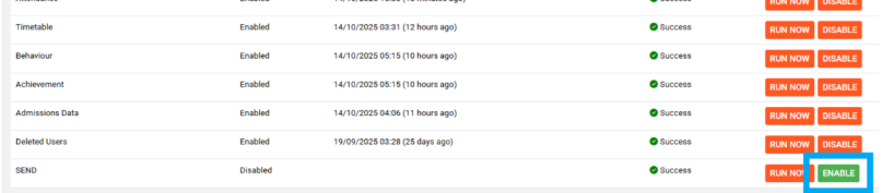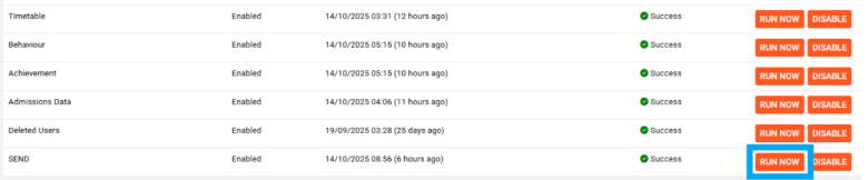 8. To capture your MIS data for SEND, click on “Run Now” to get the data through immediately.
